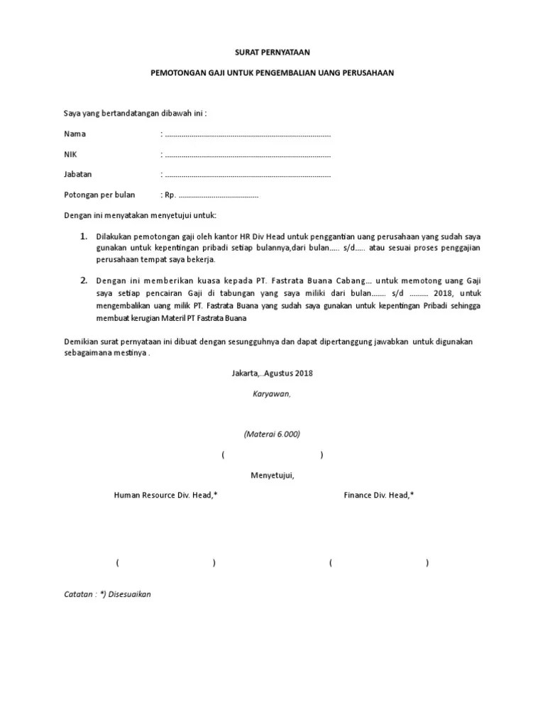 Contoh Surat Pemotongan Gaji Dari Perusahaan : Contoh Surat Keterangan Karyawan. 26 setiap bulannya, atau sesuai proses penggajian perusahaan tempat saya bekerja. Pemotongan gaji untuk pembayaran angsuran pembiayaan. Contoh surat keterangan pemotongan gaji bpjs kesehatan untuk karyawan perusahaan. Draf perjanjian pelatihan kerja dan ikatan dinas. Draf surat kuasa manajer hrd (untuk mengurusi hubungan ketenagakerjaan perusahaan); Draf surat kuasa untuk melakukan pemotongan gaji karyawan (download sample) . 1) penyisihan sebagian atas pembayaran gaji dan/atau tunjangan yang berhubungan dengan pangkat/jabatan dan/atau pekerjaan .